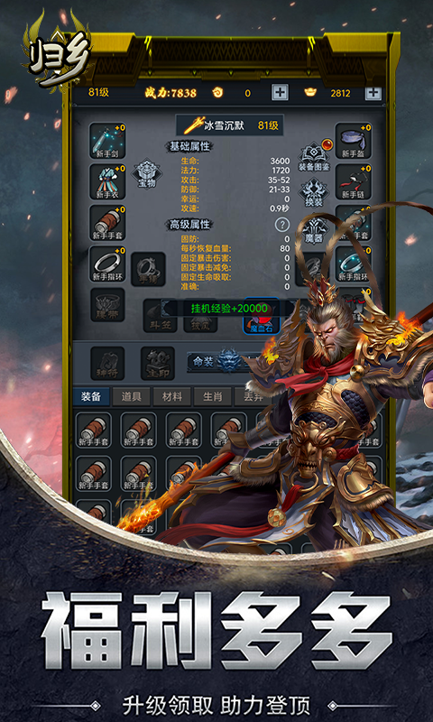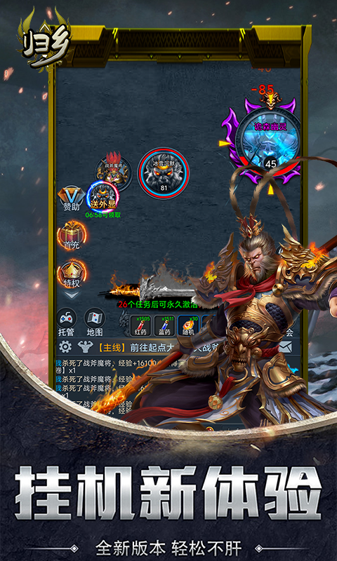 《归乡》是一款以放置类RPG文字挂机为核心玩法游戏,提供了丰富多样的BOSS战斗体验,让玩家沉浸在不断挑战与征服BOSS的乐趣中。游戏中的所有装备都可以通过打怪获得,无需GM干预,玩家可以自由搭配神器和魔器,即便是小怪也有可能掉落顶级装备,为玩家提供广泛的装备选择和搭配乐趣。